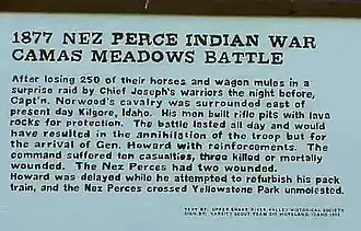 Sensing an opportunity, the Nez Perce decided to raid the army camp at Camas Meadow. After traveling half the night, they surprised the camp just before dawn, making off with 200 pack mules and several horses. General Howard sent out three columns of men in pursuit. One of these, a 50-man detachment under Captain Randolph Norwood, advanced well ahead of the other two, and became encircled by Nez Perce, digging rifle pits to escape sniper fire from all sides. After several hours, General Howard's main force arrived, and the Nez Perce retreated. The Army stopped to regroup, and lost the trail of the Indians, whose depleted force was not captured until six weeks later.[3]