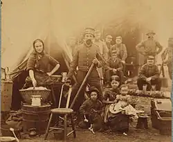 In the military history of the United States camp followers were important in servicing and supplying the army during the Revolutionary War. There were also camp followers on both the Union and Confederate sides of the Civil War.[5] However, a major difference between the armies of the American Revolution and the Civil War was the presence of women and children. By the time of the Civil War, camps and campaigns included far fewer wives, children and other relatives of soldiers. Women still served as nurses in hospitals and in other limited support roles, but were not present in the same way as in the earlier war.[5]