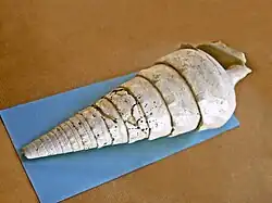 Fossil shell of Campanile auvertianum from France, on display at Galerie de paléontologie et d'anatomie comparée in Paris