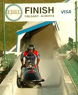 In 1981, Calgary was awarded the 1988 Winter Olympics over Falun, Sweden and Cortina d'Ampezzo.[2] The track was constructed on a fast-track program running from fall 1984 to spring 1986.[3] This was done with the help of East German technology and a consulting firm from Canada.[3] It was the first combined track in North America and only the second of its type on the continent (Lake Placid, New York in the United States bobsleigh and luge tracks were separate when Calgary's construction was completed in spring 1986 though the Lake Placid track would be rebuilt as a combination track in January 2000.[4][5]). During the 1988 Winter Olympics, the bobsleigh team from Jamaica debuted at these games, but crashed out during the third run of the four-man event.[6][7][8] The story of the team would later be part of the 1993 film Cool Runnings with scenes done at the track. Skeleton was introduced to the track in the late 1980s with the track hosting the FIBT World Championships for skeleton in 1992.[9] An indoor iced push facility near the track opened up in 2001.[10] When competition does not occur on the track, it offers programs for bobsleigh and luge open to the public.[11]