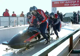 American Mike Kohn (front left) pushing his four-man team to a third-place finish at the US National Bobsled trial held in Calgary on October 22–23, 2005.