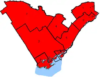 The Liberal wave that swept through Ontario in 2015 saw the Liberals take four seats in eastern Ontario, mostly in more urbanized areas (Kingston, Belleville, Hawkesbury). The Conservatives won the other four.