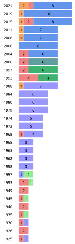 | Election | Liberal | Conservative | New Democratic | Green | People's | PC | Reform / Alliance |