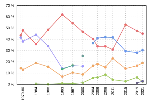 | Election | Liberal | Conservative | New Democratic | Green | PC | Reform / Alliance |