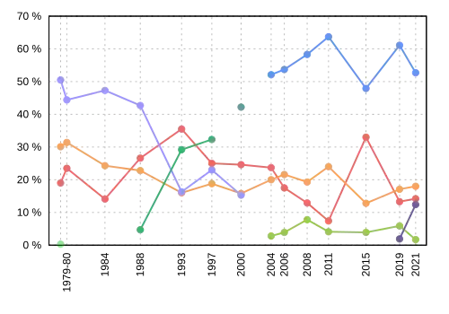 | Election | Liberal | Conservative | New Democratic | Green | People's | PC | Reform / Alliance |