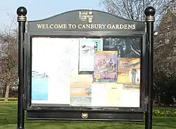The park consists of open lawns and a band stand. Several hard surface tennis courts are available to the public. The toilet block, closed in 1984, has been converted into the 'Canbury Secret Café'. The Gardens have been included in the UK Government's Playbuilder Project, a national project funded by the Department for Children, Schools and Families (DCSF) for developing play areas.[4] Also within the site are Kingston Rowing Club[5] and the "Boater's Inn", a local jazz venue.[6] Until 2009, the gardens hosted the yearly Green Fair event where band concerts were held and fundraising for local charities. This event has since been cancelled.[7] The gardens also host a Dragon Boat race.