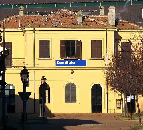 Candiolo railway station (Italian: Stazione di Candiolo) serves the town and comune of Candiolo, in the Piedmont region of northwestern Italy.[1] The station is a through station of the Turin-Pinerolo-Torre Pellice railway.