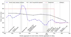The City of Cape Town implemented significant water restrictions in a bid to curb water usage, which reduced its daily water usage by more than half to around 500 million litres (130,000,000 US gal) per day in March 2018.[6] The fall in water usage led the City to postpone its estimate for "Day Zero", and strong rains starting in June 2018 led to dam levels recovering.[7] In September 2018, with dam levels close to 70 percent, the city began easing water restrictions, indicating that the worst of the water crisis was over.[8] Good rains in 2020 effectively broke the drought and resulting water shortage when dam levels reached 95 percent.[9]