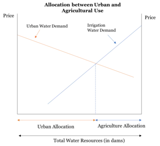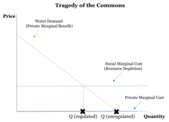 Surface water and rainfall exhibits properties of a common pool resource, which is subject to the tragedy of the commons. In the absence of regulation, self-interested individuals will make consumption decisions that deplete the commons, leading ecologist Garrett Hardin to declare that "freedom in a commons brings ruin to all".[86] This is particularly acute during a water crisis when total supply may fall short of even the socially optimal level of consumption. As such, the City attempted to regulate use of the commons through exhortations for responsible use, direct allotment and use of water tariffs (for consumers to internalize the social marginal cost of their decision making).