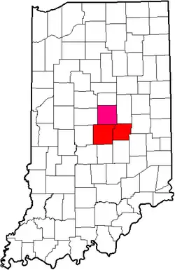 The Capital District Conference in Indiana. Counties in red contained schools at the time of disbanding, counties in pink contained former member schools who left before conference folded.