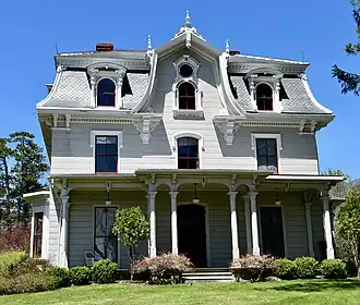The John McGilvery House stands on the north side of East Main Street (United States Route 1), at its northeast corner with Black Road. It is set back from the road, and stands next to the house of his brother William, an even more elaborately decorated building. It is a three-story wood-frame structure, topped by a mansard roof and clad in wooden shingles. It has an L-shaped plan, with a single-story porch at the crook of the L, which extends to the right to join with a period carriage barn. The mansard roofs of both the house and barn are studded with mini-gabled bracketed dormers, and the roof lines are studded with paired brackets. The main entrance is framed by pilasters topped by a corniced entablature, with a two-story projecting polygonal bay to its left.[2]