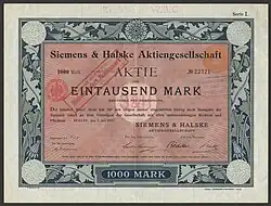 Share of the Siemens & Halske AG, signed by Carl Heinrich von Siemens as senior chief executive.