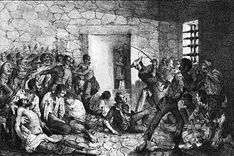The last 3 years of the conflict also produced numerous atrocities. Again, it was Cabrera emerging as the key protagonist.[20] In October 1838 in 3 separate executions in Maestrazgo on his orders some 250 POWs were shot. In case of Horcajo the crime was somewhat elaborated: 96 NCO captives from different units and held in various locations were first assembled, and then shot. In case of the Villahermosa carnage apart from enemy combatants the victims included children under 12 and the elderly over 70; when combing the town for combatants, the Carlists herded to execution spots whoever they thought might have been even remotely engaged in resistance. Even in relatively calm Galicia one carnage (Boqueixón, September 1838) involved 40 Voluntarios and their families.[21] However, the largest crime took place in La Mancha, in Calzada de Calatrava (February 1838). The defenders took refuge in a massive stone-built local church; the Carlist commander, Basilio Garcia, brought in the artillery and ordered fire. After a few salvos many of the besieged decided to surrender, yet the Carlists kept firing. In the chaotic scene that followed some Cristinos soldiers were asking for pardon, some were trying to flee, and some kept hiding in the church, still pounded by the artillery. The total number of victims can be only estimated, with figures ranging from 150 to 300.[22] Almost similar in scale was the carnage in Moià (October 1839), which stands out for cruelty; tens of civilians and prisoners were killed by having their throats cut.[23] The last large-scale execution, in Bojar, took place in late May 1840, it is few weeks before the end of the conflict (37 prisoners). During final stages of the war increasingly fragmented Carlist commanders were executing own generals (fusilamientos de Estella, February 1839).[24] According to later not necessarily credible calculations by a vehemently anti-Carlist author - yet with underestimated figures in few cases[25] - during the entire war there were 2,843 fatal victims of Carlist executions, mostly in 1836 (819) and 1837 (804), and 54 summary executions with at least 10 victims.[26]