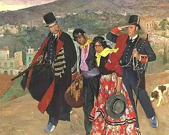 He had his first solo exhibition at the Sala Parés in 1903. Over the next few years, he had several showings at the Salon and, in 1906, was named a Knight in the Order of Alfonso XII, for his work depicting members of the Mossos d'Esquadra (Catalan police force) arresting a Romani couple. In 1908 his painting, "La Suegra" (The Mother-in-Law), was shown at the Salon and purchased by William Randolph Hearst. Two years later, he received a First Class prize at the National Exhibition for "The Wounded Torero".[1] Shortly after, his "Honeymoon in the Ansó Valley" was acquired by Archer Milton Huntington, for the Hispanic Society of America. He became a member of that society in 1914.