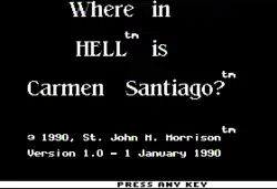 Where in Hell Is Carmen Santiago? is a 1990 game developed by St. John M. Morrison, which has players hunt down Carmen in the afterlife. Broderbund never recognized this as a part of the series.[28][29] It has the status of "a Copyrighted FreeWare".[30] The title screen started with the word "Heck", which was rubbed off and replaced with "HELL".[28] The creator of the game had never played a Carmen Sandiego game, but was very familiar of the franchise due to its constant appearance in gaming magazines. He crafted a first person adventure game based on this premise and copied the naming scheme of the titles.[31][30]