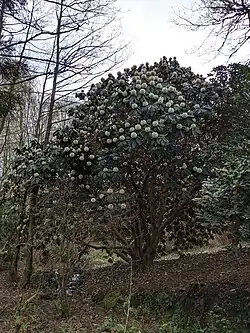 • Rhododendron falconeri - white flowering shrubs with large leaves characterised by rusty coloured woolly undersides, native to the mountains of North India. Emma Darwin mentioned the flowers of these specimen in her 1846 letter to Hooker: 'We have just received a blossom of Rhod Falconeri which has flowered in the open air at my brothers on Leith Hill Surrey'.[40][42]