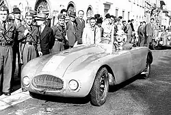In 1948, Ala d'Oro built a Barchetta for the Florentine racing car manufacturer Ermini, which was based on a Fiat 1100 chassis and had a Fiat engine reworked by Ermini. The car, with the chassis number 214184, had a flat pontoon-style body with a horizontal beltline and rounded front and rear sections. As was usual with Ala d'Oro, the headlights were set far down in the front mask. The cooling air opening was oval in shape and had a grille.[11] Pasquale Ermini started with the car in the 1948 Mille Miglia. He did not finish; the car was badly damaged in an accident. Ermini sold the accident-damaged car to Camillo Rossi, who commissioned Carrozzeria Mariani to repair the body. Mariani designed a new front end with a square cooling air intake and a bulge above the rear wheels that interrupted the otherwise horizontal belt line. Rossi took part in the first edition of the Coppa della Toscana in 1949 with this car. The car exists today and still has the Mariani body.