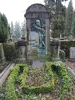 On 20 June 1902 Brambach died in his home in Bonn. His funeral was accompanied by singers from all over Germany. With great sympathy of the German minstrelsy, two years after his death a memorial designed by the architect Karl Senff was built on his grave at the cemetery in Poppelsdorf. The relief on his donated, well elaborate tomb is signed by the Bad Honnef sculptor Charles Menser (1872–1929) and bears the inscription "Dedicated to German singers".[2][n 2] It is now a grave of honour, located under the Cross Mountain Church.[2]