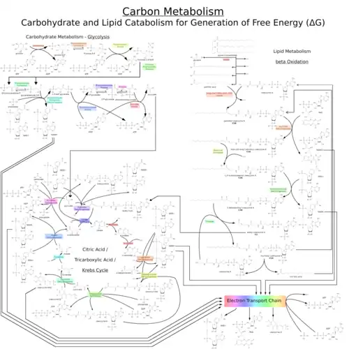 Carbon Catabolism pathway map for free energy including carbohydrate and lipid sources of energy