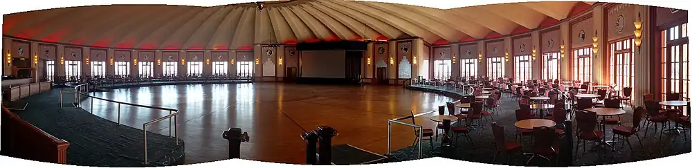 The upper-level houses the 20,000-square-foot Catalina Casino Ballroom. It is the world's largest circular ballroom, with a 180-foot (55 m) diameter dance floor that can accommodate 3,000 dancers.[1] French doors encircle the room connecting the dance floor with the Romance Promenade, an open balcony that runs around the building.
