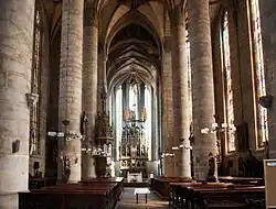 The sacristy was constructed on the northern side of the presbytery together with the tower. The walls of the nave and side aisles were fully built until the beginning of the Hussite Wars (around the 1420s). The height of the northern tower did not exceed the height of the cornice. The church was roofed only with a frame shaped into a tall tent roof, with a tower for smaller bells. This enabled the usage of the church even before it was finished.