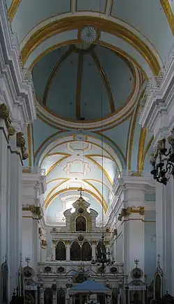 The naves of the temple, the interior of which has preserved its volume-space composition of the XVII century, are overlapped by cylindrical vaults with decks. Above the babiniet of the temple there are choirs.[1] During the reconstruction in 1735 for the façade of the church and its interior was made a single order design. Thus, the walls and pillars of the temple are characterized by the scattering of pilasters and wide cornice belts, whose decoration is a rich floral ornament with motifs of stylized acanthus leaves in addition to high relief images of angels' heads. The decoration of the vaults, especially the plafonds and the frames of the ribs of the decks, is characterized by geometric stucco ornamentation. The long gallery, which runs along the entire perimeter of the temple's entablature, is surrounded by a forged metal grille with ornamentation.[1][21][2] The molding used in the interior decoration is made in the technique of stucco.[21][11][4] In the interior, the mediocrest is decorated with a flat and false dome.[58]