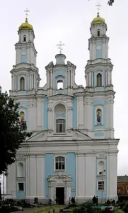 The Cathedral of the Nativity of the Virgin (Belarusian: Сабор Нараджэння Прасвятой Багародзіцы) is an Orthodox cathedral in the city of Hlybokaye, Vitebsk Region, Belarus (originally the Church of the Assumption of the Virgin Mary of the Carmelite Order). It is located in the historical center of the town on the 17th of September Square.[1][2] It is the first monument and the most complete expression of the Vilnian Baroque[3][4] school in Belarus,[5][6][7] reflecting "important stages in the development of the artistic principles of the Belarusian Baroque".[8] According to the researcher V. A. Chanturia, this cathedral is a rather peculiar type of religious architecture, because even in Europe temples with four towers of the Baroque period were very rare.[9] Before the reconstruction in the 1730s,[10][6] it was the only Sarmatian Baroque monument with a transept.[10][Note 1]
