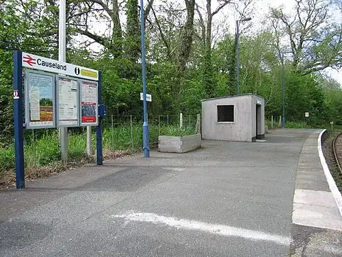 Very few facilities are provided at Causeland, consisting of a simple waiting shelter, an information board and a payphone.[1]