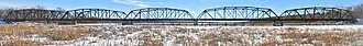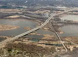 The Cedar Avenue Bridge carries Minnesota State Highway 77 across the Minnesota River between the Minneapolis-St. Paul suburbs of Bloomington and Eagan, Minnesota. The two parallel crossings for northbound and southbound lanes are respectively 5,159 feet (1,572 m) and 5,185 feet (1,580 m) in length. It was built in 1979, superseding an older swing bridge by the same name that was composed of low-lying truss segments. The modern bridge has three lanes in each direction, in addition to a shoulder which is often used by buses to get past traffic slowdowns.[1]