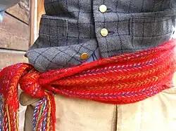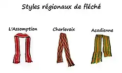 The ceinture fléchée [sɛ̃tyʁ fleʃe] (French, 'arrowed sash') or ('arrow sash') is a type of colourful sash, a traditional piece of Québécois clothing linked to at least the 17th century (of the Lower Canada, Canada East and early confederation eras). The Métis also adopted and made ceintures fléchées (French-Canadian and later Metis or Michif translation: "Sayncheur Flayshii" or "Saenche(i)ur Flechey") and use them as part of their national regalia. Québécois and Métis communities share the sash as an important part of their distinct cultural heritages, nationalities, attires, histories and resistances. While the traditional view is that the ceinture fléchée is a Québécois invention, other origins have been suggested as well including the traditional fingerwoven Gaelic crios. According to Dorothy K. Burnham who prepared an exhibit on textiles at the National Gallery of Canada in 1981, and published an accompanying catalogue raisonné, this type of finger weaving was learned by residents of New France from Indigenous peoples.[1][2] With European wool-materials, the syncretism and unification of Northern French and Indigenous finger-weaving techniques resulted in the making of Arrowed Sashes. Arrow Sash is the oldest known sash design; produced by Québécois artisans in XVIIIth century, and later on L'Assomption sash after 1852.