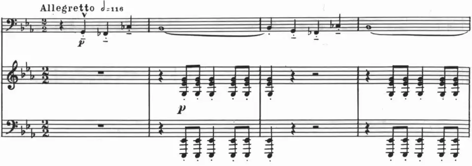 The theme is simplified even further in the woodwind, which reappears throughout the work: