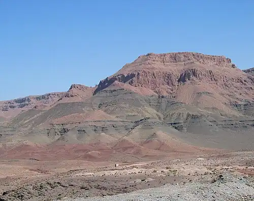 Ages were determined by 40Ar/39Ar analysis on plagioclase.[10][11][12] These data show indistinguishable ages (199.5±0.5 Ma) from Lower to Upper lava flows, from central to northern Morocco. Therefore, CAMP was an intense, short magmatic event. Basalts of the Recurrent unit are slightly younger (mean age: 197±1 Ma) and represent a late event. Consistently, the Upper and Recurrent basalts are separated by a sedimentary layer that locally reaches a thickness of about 80 metres (260 ft).