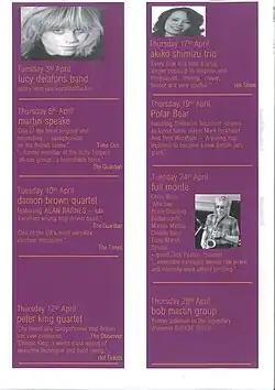 Musicians who played at the club included Scottish jazz guitarist Jim Mullen (voted world's 5th best guitarist in 1982),[1][2] Saxophonist Gilad Atzmon (who has recorded and performed with The Blockheads, Paul McCartney and Sinead O'Connor),[3] English jazz trumpeter and composer Guy Barker (appointed Member of the Order of the British Empire (MBE) for services to jazz),[4] acclaimed English alto saxophonist and clarinetist Peter King (who appeared on the soundtrack of the 1969 film The Italian Job and the film The Talented Mr. Ripley),[5] American drummer Gene Calderazzo,[6] English jazz drummer Martin Drew (who worked with Canadian virtuoso Oscar Peterson from 1974- 2007),[7] British drummer and composer Seb Rochford (Mercury Prize Nominee),[8] British saxophonist and composer Pete Wareham (Young Jazz Musician of the Year 1997),[9] multi-award winning jazz saxophonist Alan Barnes,[10] British saxophonist Martin Speake[11] and award-winning English jazz composer and pianist Zoe Rahman.[12]