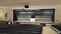 Enclosing more than 100,000 square feet[11] with a capacity for 500 students,[64] the school building is divided into two wings.[11] The academic wing contains sixteen classrooms, four science labs, two art labs, computer lab, and the student center. The social wing is bounded on one end by the 1400-seat Cvengros Gymnasium and on the other by the performing arts center - a 560-seat auditorium, audio lab, band room, and chorus room. Between are a 100-seat chapel, cafeteria, commons area, faculty dining area, welcome center, main office, weight room and four locker rooms.[11][15][62]