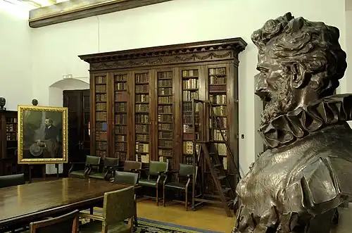 Finally, the oil portrait of Isidre Bonsoms, by the painter José María Vidal-Quadras and the bronze bust of Cervantes by the sculptor Josep Reynés, preside in the Sala Cervantina of the Biblioteca de Catalunya.[6]