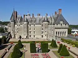 The Château de Langeais is a 15th-century Flamboyant Gothic castle in Indre-et-Loire, France, built on a promontory created by the small valley of the Roumer River at the opening to the Loire Valley. Founded in 992 by Fulk Nerra, Count of Anjou, the castle was soon attacked by Odo I, Count of Blois. After the unsuccessful attack, the now-ruined stone keep was built; it is one of the earliest datable stone examples of a keep. Between 994 and 996, the castle was besieged unsuccessfully twice more. During the conflict between the counts of Anjou and Blois, the castle changed hands several times, and in 1038 Fulk captured the castle again.
