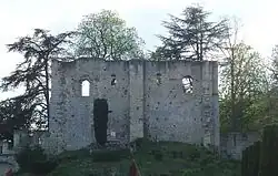 According to contemporaneous chronicler Richer, the castle built by Fulk Nerra in the 990s consisted of a tower and a surrounding enclosure. The 10th-century keep still stands, albeit in a ruinous state. It is the earliest example of Romanesque architecture in the region.[14] It is uncertain where the stone used in construction was quarried.[15] A detailed study has been done on the cost of construction of the tower. It is 16 metres (52 ft) high, 17.5m wide, and 10m long with walls averaging 1.5m thick. The walls contain 1,200 cubic metres (42,000 cu ft) of stone and have a total surface area (both inside and out) of 1,600 square metres (17,000 sq ft). The tower is estimated to have taken 83,000 average working days to complete, most of which was unskilled labour.[16] The wall enclosing the keep stretched for some 250 m (820 ft).[17] The interior rooms are richly decorated.
