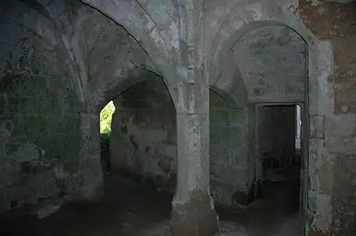 In the east, is the residence (12th, 14th, 15th centuries) which was occupied by the lord of the manor; to the north, what could be the crypt of the castle chapel (15th century); in the centre, a large ceremonial building built in the last years of the 15th century, starting from an older structure (12th century). It still has remarkable vaults with the arms of the Bourbon-Vendôme family and a niche for oil lamps decorated with three masks. A guard room (end 15th century) is installed under this staircase in order to control movement in the underground galleries.