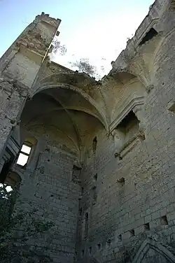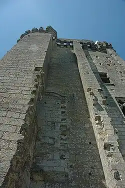 Above the door can be seen the arms of Jean VII of Bourbon-La Marche, count de Vendôme from 1372 to 1393. Higher, one can still see the remains of the door giving access to the first floor of the keep from the top of the curtain wall. Inside, the overall picture is impressive. On the first floor are a chimney with the arms of Charles VII supported by two angels (about 1420) and a multi-bayed window (14th century). Especially noteworthy are the remains of the staircase, installed about 1400 in one of the keep's 12th-century corner towers and the vaulted arches of the second floor (about 1400-1415).