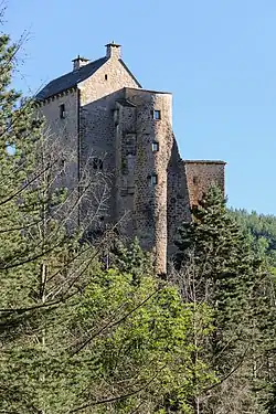 Dating from the 13th century, the castle was closely related to the history of the disorders and wars in Gévaudan over five centuries. The fortifications include a massive square keep with a high round tower on one side, an assortment of buildings and defensive works. Mullioned windows in the old seigniorial residence and the interior murals in the vault and the western building date from the Renaissance. The military architecture of 13th and 14th centuries is evident from the use of a natural defensive site with a double enceinte. It was an important local seigniory which exploited nearby silver mines. The castle has carved and painted decorations, one of the few civil buildings in this area to have preserved them.[1]