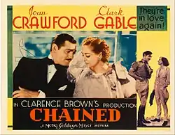 Chained is a 1934 American drama film directed by Clarence Brown and starring Joan Crawford and Clark Gable with supporting performances by Otto Kruger, Stuart Erwin, Una O'Connor and Akim Tamiroff. The screenplay was written by John Lee Mahin, Albert Hackett and Frances Goodrich based upon a story by Edgar Selwyn.[2] Ward Bond and Mickey Rooney appear briefly in uncredited roles.