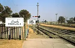 The main trunk railway line of Pakistan Railways passes through the town. Chaklala Railway Station is one of the main railway stops for trains travelling between Peshawar and Karachi.[3] Chaklala Dry Port is a dry port which handles freight trains.