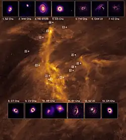 A survey of stars in Chamaeleon I with VLT/SPHERE showed that 13 out of 20 systems showed a protoplanetary disk in polarized scattered light. Systems such as HD 97048, SZ Chamaeleontis, and the WW Chamaeleontis showed morphological structures.[7] HD 97048 also shows a kink in its carbon monoxide gas disk structure, which was interpreted with the presence of a protoplanet inside around the star and inside the disk.[8] Another notable member of Chamaeleon I is OTS 44, which is a planetary-mass object surrounded by a disk.[9][10][11] Other notable objects are Cha J11110675-7636030, which has a mass of 3-6 MJ and might be surrounded by a protoplanetary disk,[12] and Cha 1107−7626 (6-10 MJ), which also is surrounded by a disk.[13]