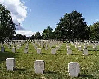 Champigny-Saint-André is a German World War II cemetery in Normandy, France. It is located 5 kilometers South of the village of Saint-André-de-l'Eure, about 25 km (16 mi) south east of Évreux. The burials are from the summer of 1944, as the Allies pushed out of Normandy towards Paris. It is the second largest of the six German war cemeteries in Normandy with nearly 20,000 burials. The cemetery is maintained and managed by the voluntary German War Graves Commission (Volksbund Deutsche Kriegsgräberfürsorge).