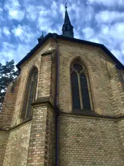The chapel is an atrium type. It is a small rectangular building of red bricks with a triangular edge. It is covered with a gabled roof holding a small turret (called Sanctus) with two suspended bells (one of them is fully functional). The turret with the bells is located above the main altar.