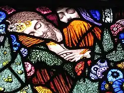 4. The Sermon on the Mount - The upper glass panels of the first lancet show six disciples attending Jesus' most celebrated teachings as recounted in the Gospel of Matthew.[16] In the second, Jesus speaks to a crowd from an elevated mound, where he is attended by two disciples.[17]