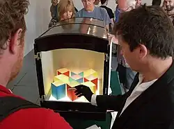 Inspired by the work of French chemist and colour theorist Eugene Chevreul, Keeley was a regular performer at the London Royal Polytechnic in the 1860s, which was chaired by distinguished scientist and aeronautical engineer Sir George Cayley.[3] Keeley became famous for an innovative form of magic lantern display in which abstract colour slides replaced the normal representational and narrative forms. By employing geometric and repetitive patterns his projections had the effect of producing afterimages in the eyes of his audiences (it may be that Keeley was familiar with studies of the afterimage made earlier in the century by Goethe and by Czech scientist Jan Purkinje).[4]