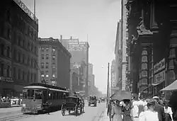 State Street looking north at Monroe c. 1900. Pike's Building at 170 (now 106 S.) State Street, where the Art Institute first opened its doors as The Academy of Fine Arts, is shown to the far left, with the second Palmer House (1873) directly across the street on the far right.