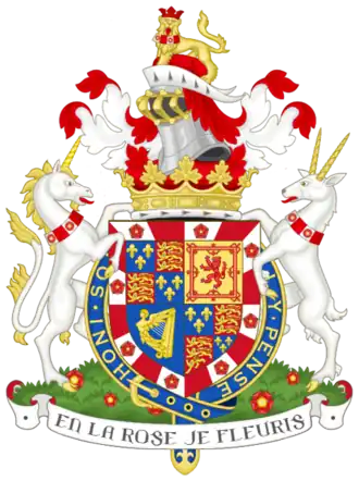 The Royal Arms of King Charles II of England (viz. quarterly: 1st and 4th, France and England quarterly; 2nd, Scotland; 3rd, Ireland); the whole within a Bordure compony Argent charged with Roses Gules barbed and seeded proper and the last.