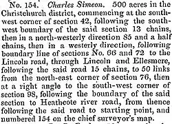 Simeon chose 500 acres (2.0 km2) of land and had frontages with the road leading to the Ōpāwaho / Heathcote River and the road leading from Christchurch to Halswell. The land was numbered in the order of it having been chosen, and his land was thus known as Rural Section 154.[29] He also owned town properties in Armagh, Gloucester, Manchester and Madras Streets.[30]